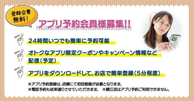 ホーム > PA.ZA.PA. > INFO > 簡単!いつでも!アプリ予約!導入しました 簡単!いつでも!アプリ予約!導入しました メニューを選び⇒担当者を選び⇒時間を選ぶ。 簡単操作で予約ができます。 ※種池店/二の宮店/武生店/森田店/和田東店の5店舗にて、ご利用可能です。 ※アプリ予約会員になる為には、ご利用店舗の来店が、一度必要となります。 キャンペーン クーポン エコプロジェクト